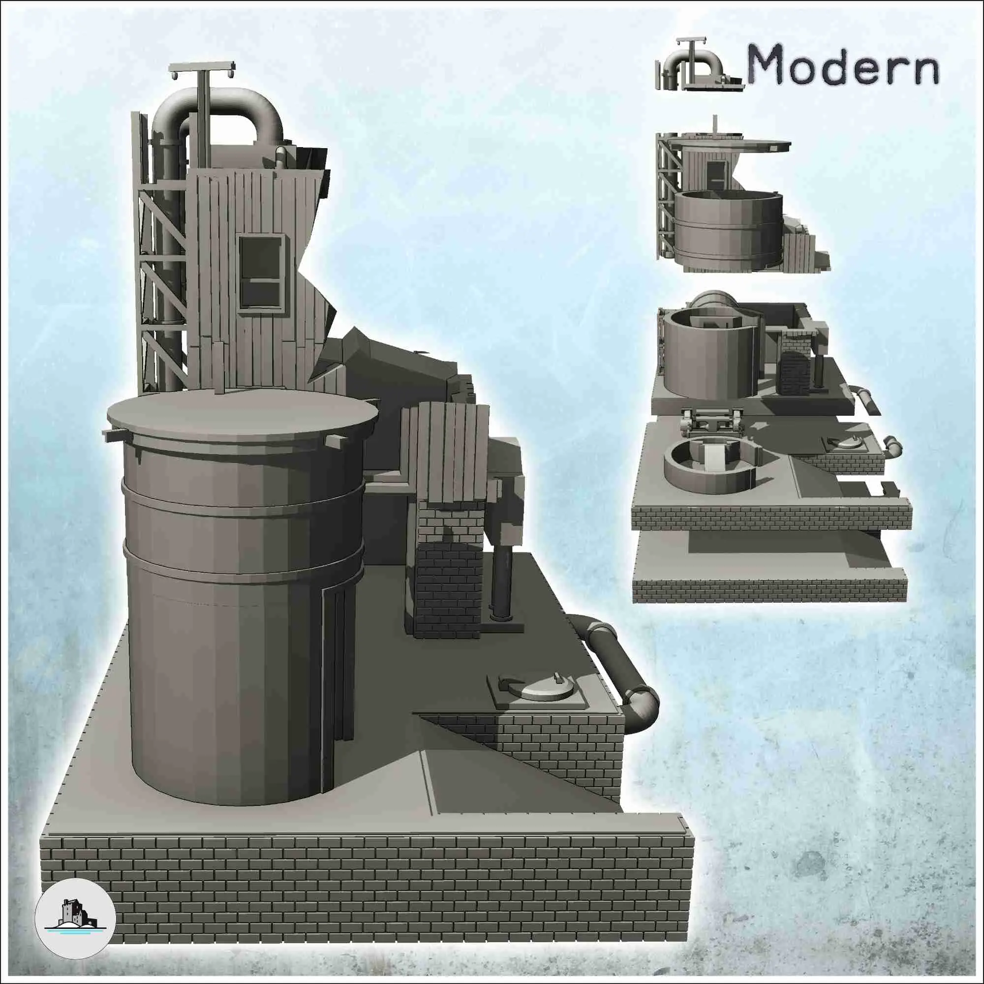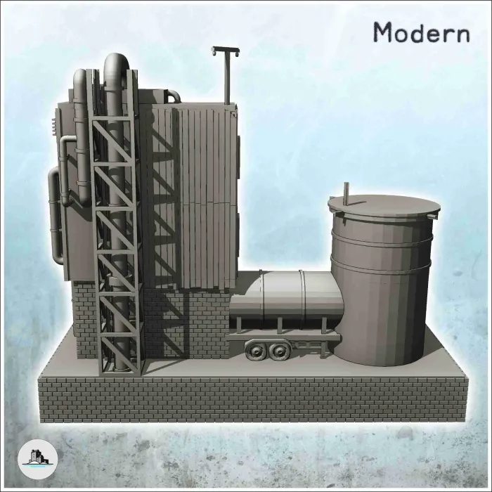 Brick industrial plant on platform with auxiliary tank (ruin